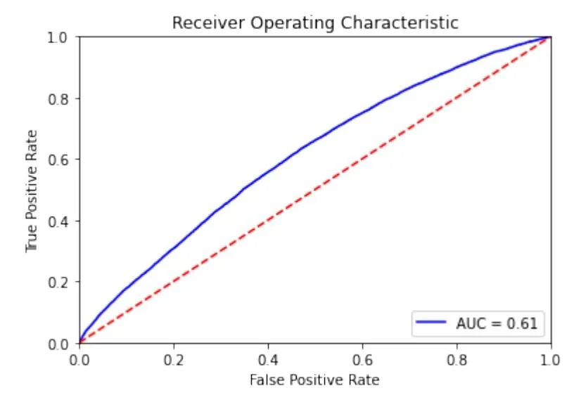 The performance of our logistic regression model reveals several key metrics. The model's precision is 75%, meaning 75% of the predicted defaults were actual defaults. However, the recall is very low at ~0.03%, indicating that most actual defaults are missed. The F1 score, which balances precision and recall, is approximately 0.0006, highlighting significant issues despite the high accuracy. The ROC curve and AUC score of ~0.61 show that the model's ability to distinguish between classes is only slightly better than random guessing. Overall, these metrics suggest that while the model is good at predicting non-defaults, it struggles significantly with identifying defaults.